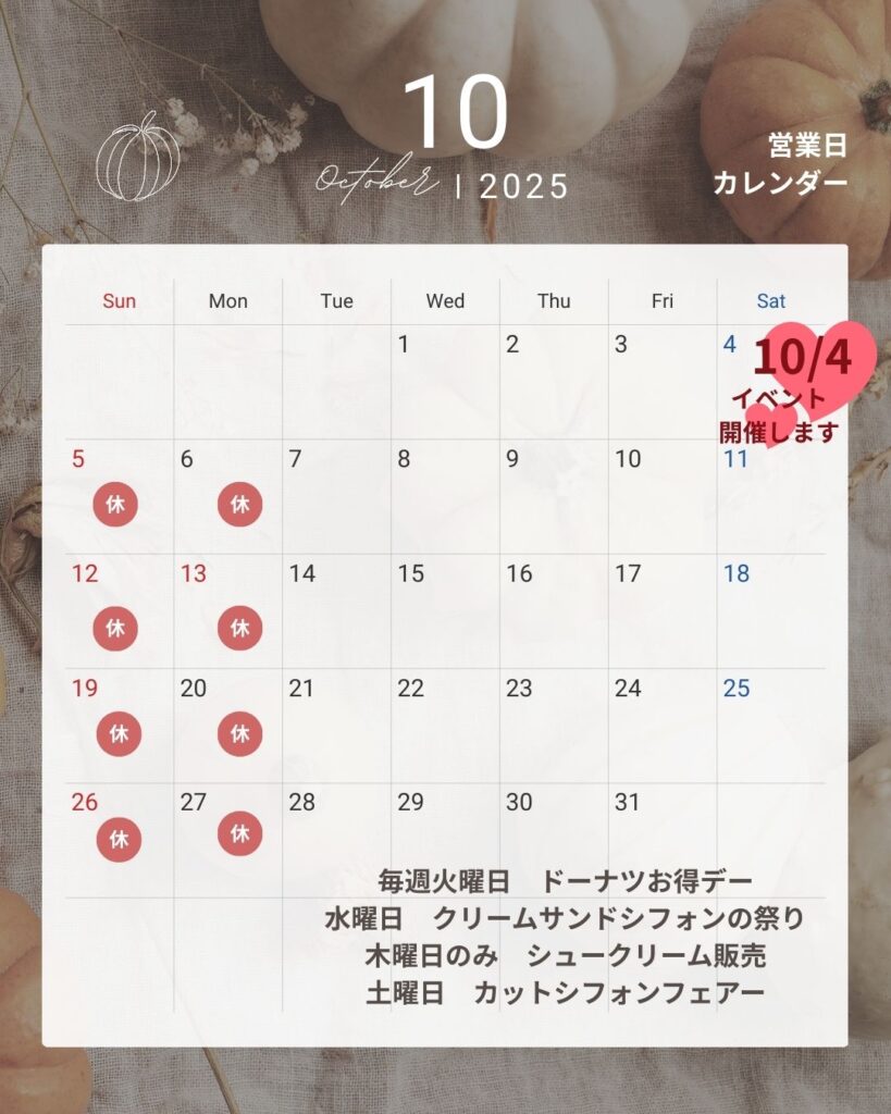 シフォンケーキ専門店Atriaです。いつもご愛顧いただきありがとうございます。10月の営業カレンダーをお知らせいたします🍰 今月は特別なお知らせがあります!10月4日(金)に、年に一度の感謝イベントを開催いたします😊✨日頃の感謝の気持ちを込めて、当... -